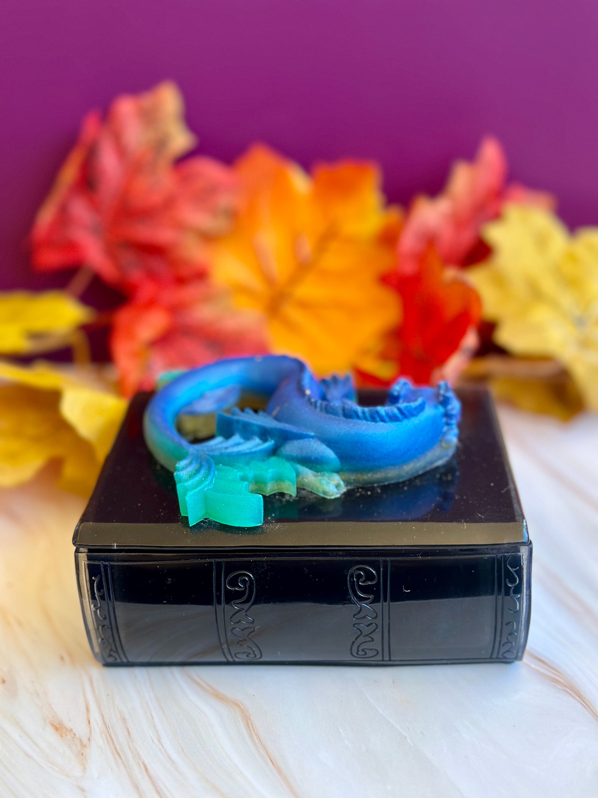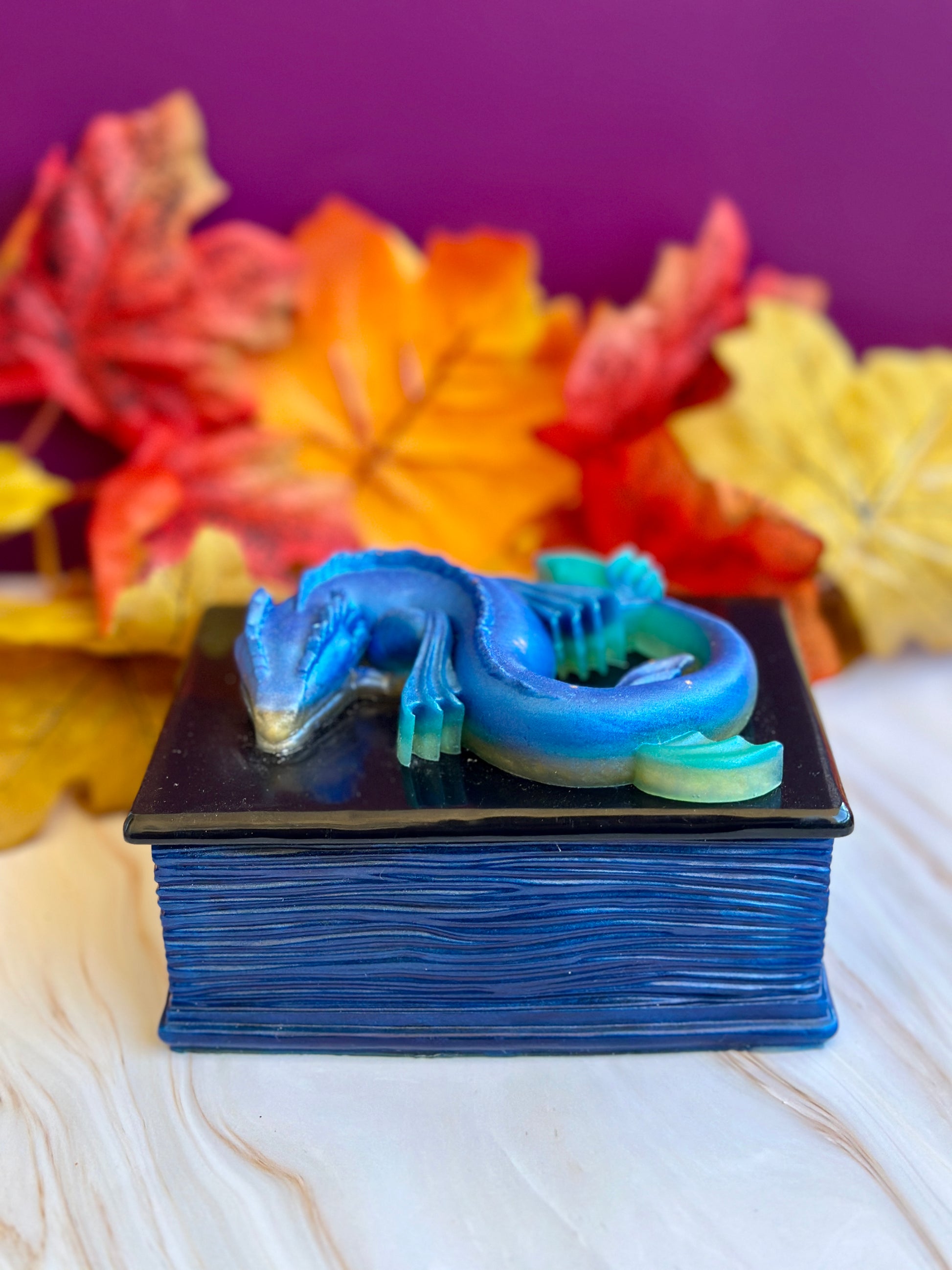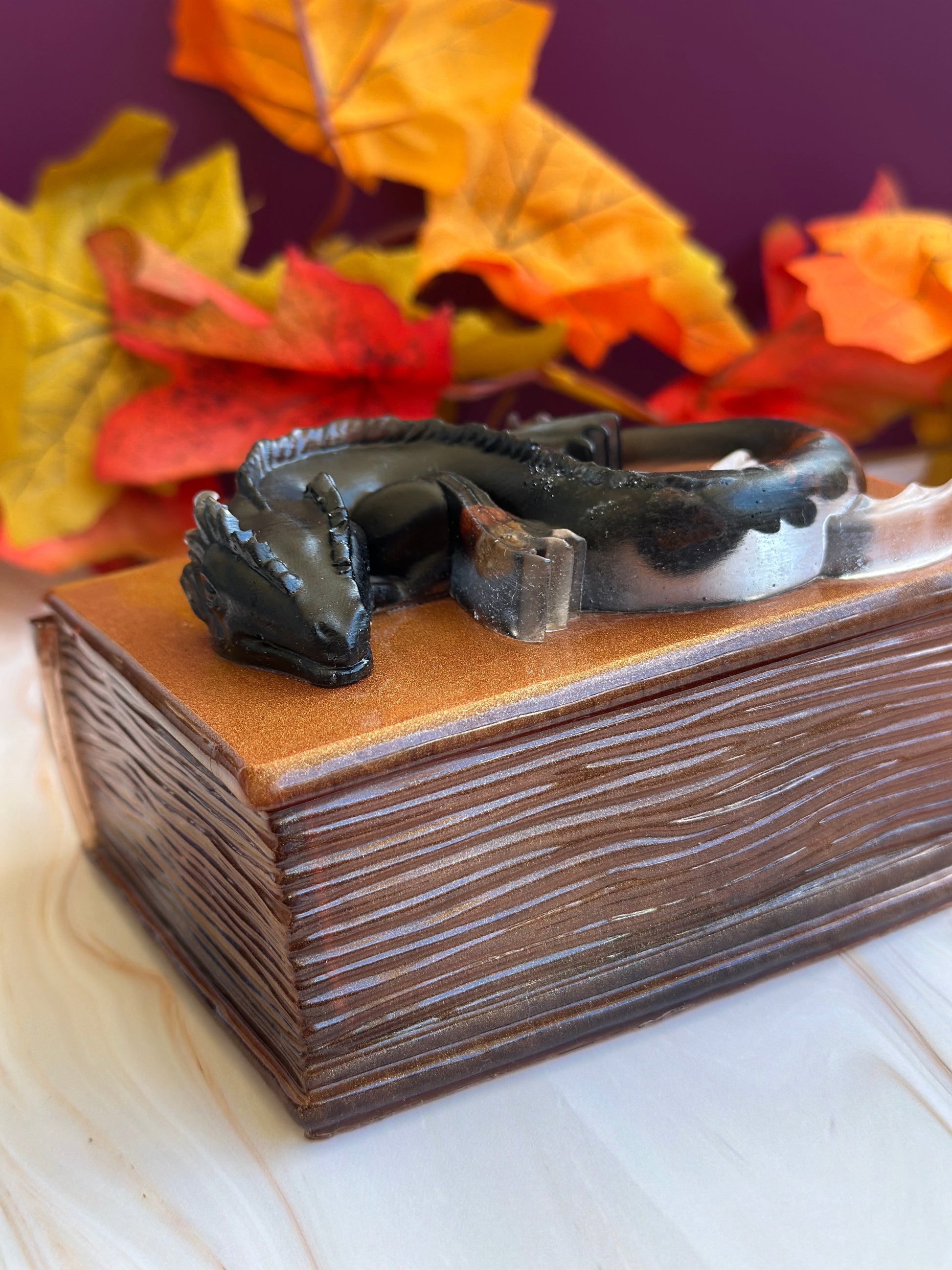 Plongez dans un univers fantastique avec cette boîte en forme de livre, sublimée par un dragon noir incrusté de pierre volcanique 🐉✨.