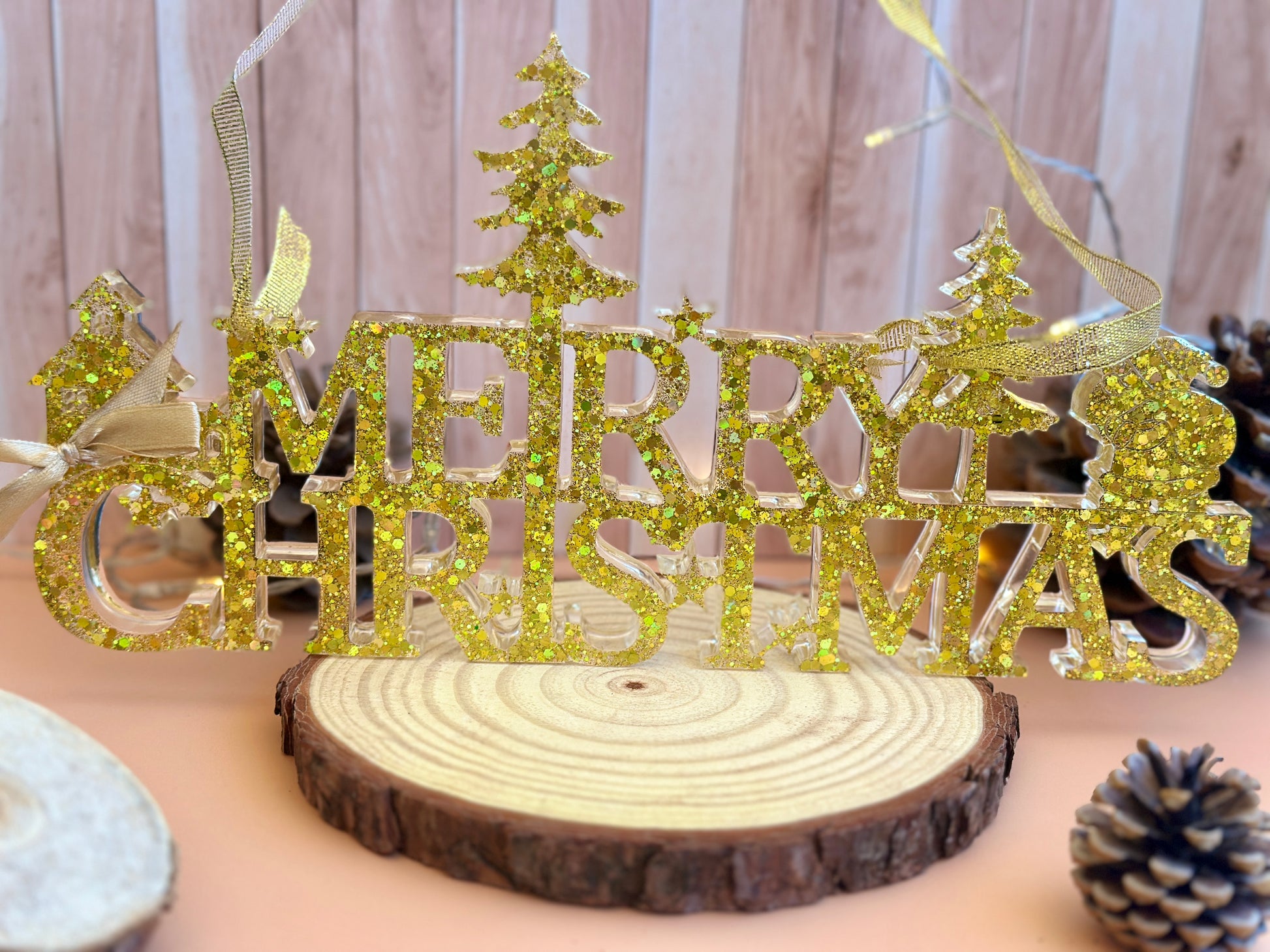 Apportez une touche artisanale et élégante à vos fêtes avec cette décoration “Merry Christmas” en résine époxy.